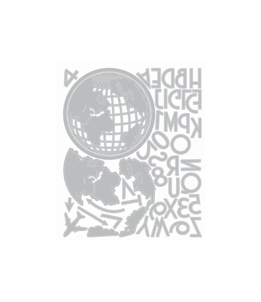Buchstaben mit Zahlen, Weltkugel, Flugzeug, 2 Pfeile und Wolke