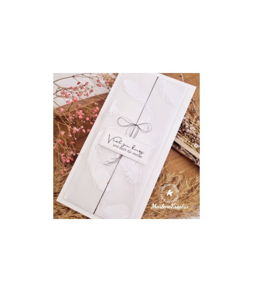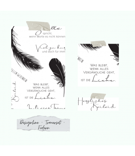 Das „Designline – Trauerset – Federn“ Silikon Stempelset besteht aus 8 Stempeln auf einem grossen A6 Sheet
