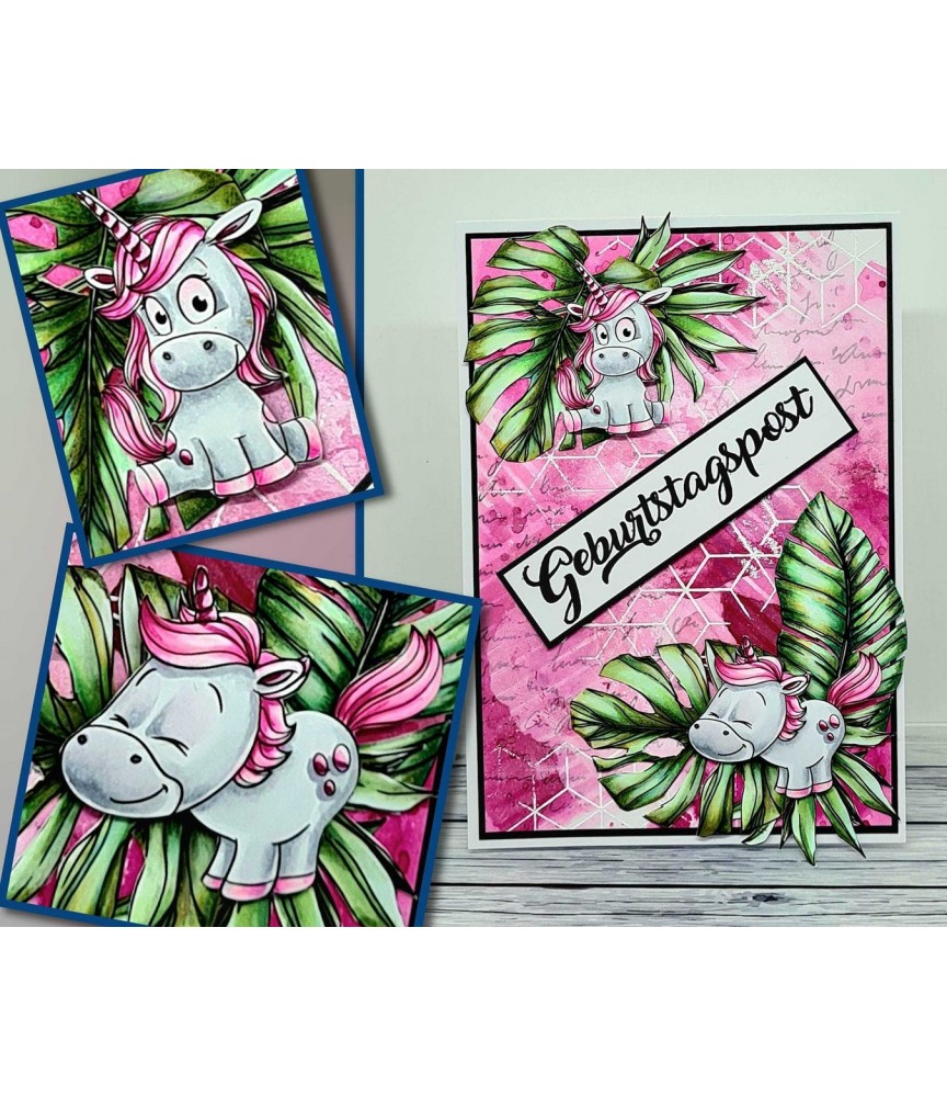 Inhalt: 13 Clear Stamps / Silikon Stempel A6 grosses Stempelset bestehend aus 13 Motivstempeln. Die Einhörner haben eine Grösse von 3,0 cm x 4,5 cm bis 7,5 cm x 6,5 cm.