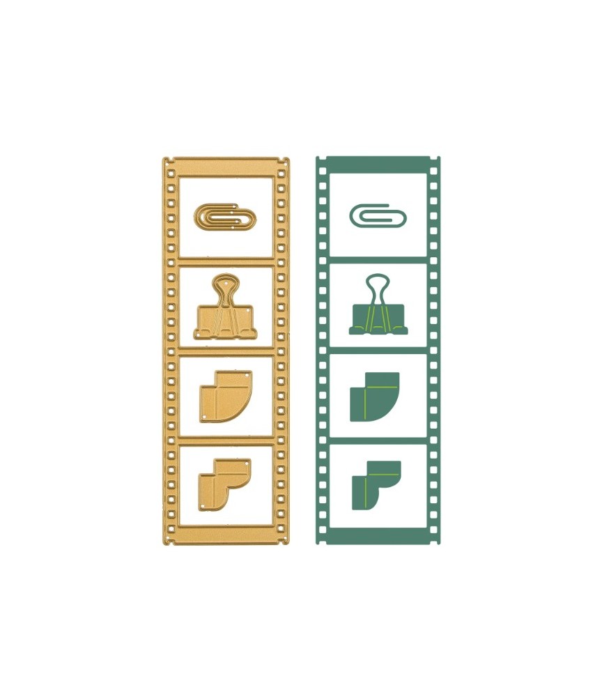 Stanzschablonen Filmstreifen retro 5-teilig mit Klammern und 2 div. Ecken Die Stanzschablone Film Streifen hat eine Grösse von ca. 7.5 x 16 cm.