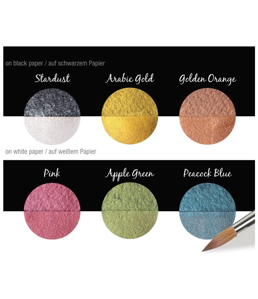 Coliro Pearlcolors sind hochpigmentierte Künstlerfarben. Sie werden mit Wasser angemischt und können mit Pinsel oder Feder verwendet werden. Sie sind wunderbar cremig und gut deckend.
