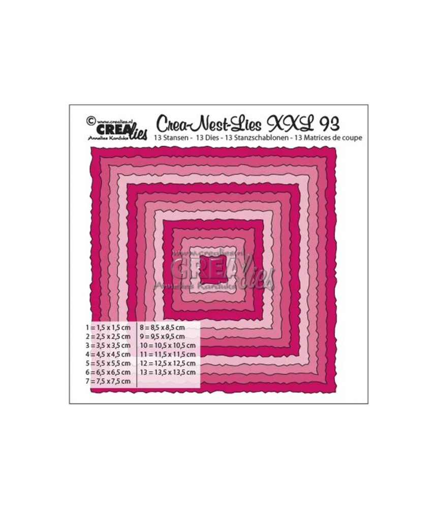 Inhalt: 13 Stanzschablonen Grösse der gestanzten Rechtecke: 15x15 mm, 25x25 mm, 35x35 mm 45x45 mm, 55x55 mm, 65x65 mm 75x75 mm, 85x85 mm, 95x95 mm 105x105 mm, 115x115 mm, 125x125 mm. 135x135 mm