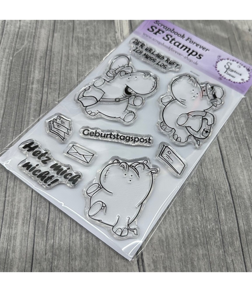 Inhalt: A6 grosses Stempelset bestehend aus 3 Textstempel und 6 Motivstempel. Texte: Die Hippos haben eine Grösse von 4,5 cm x 6,0 cm (Wander- und Posthippo) bzw. 4,3 cm x 5,0 cm.