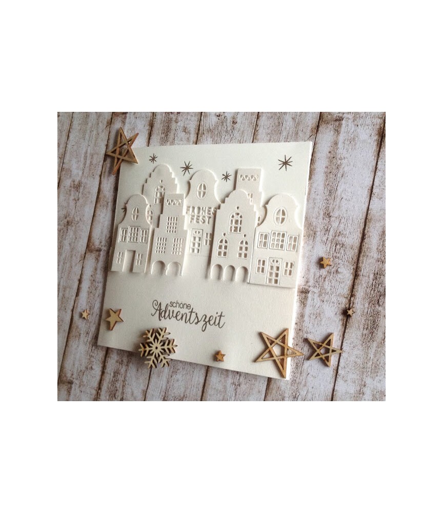 Das Stanzformenset deutsche Häuserzeile, bestehend aus 3 Häusern, nebeneinander ca. 9×6 cm. Dazu gehören Erweiterungsstanzen, man kann sich aussuchen, ob man eine weitere Fensterreihe oder ein Frohes Fest aus dem mittleren Haus ausstanzen möchtet.Somit ist die Stanze ganzjährig einsetzbar. Die 2 zusätzliche Sternchen-Stanzen kann man zum Dekorieren der Hausgiebel nutzen.