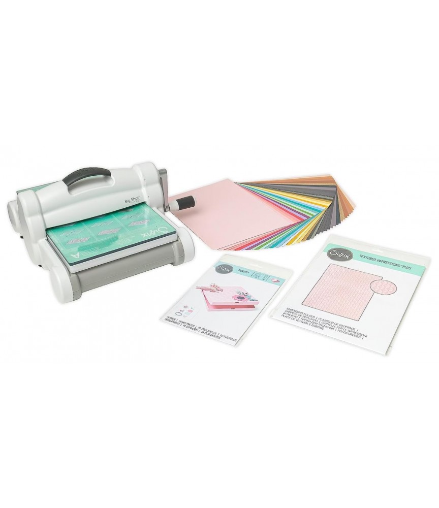 Sizzix Big Shot Plus Starter Kit White & Gray DIN A4 Use the Big Shot Plus with your die cuts and embossing folders on Foto paper, and Scrapbooking paper. Compatable with most embossing and die cuts. 21.6 cm x 27.9 cm (8 1/2" x 11"). This Starter Kit comes with paper, embossing folders and dies worth over CHF 111.00 Free shipping with this product.