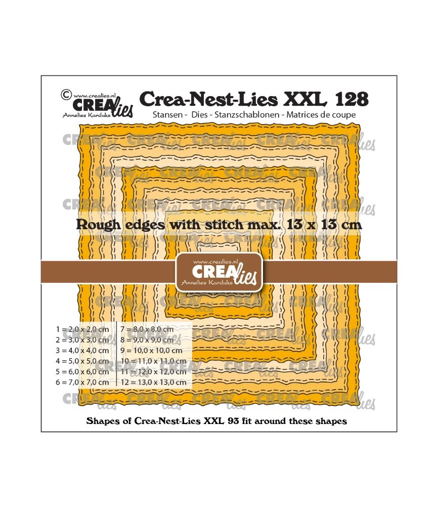 12 dies 15 x 55 mm, 25 x 65 mm, 35 x 75 mm 45 x 85 mm, 55 x 95 mm, 65 x 105 mm 75 x 115 mm, 85 x 125 mm, 95 x 135 mm 105 x 145 mm, 115 x 155 mm, 125 x 165 mm