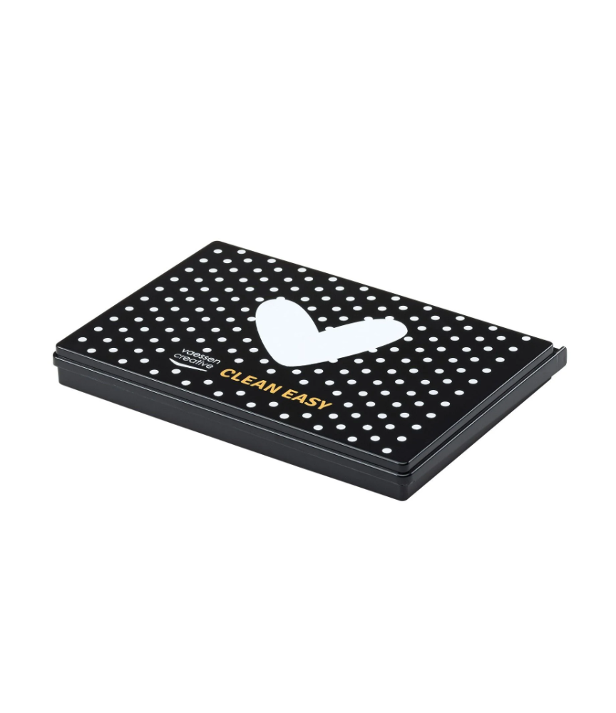 This double stamp cleaning box allows for thorough and easy cleaning of used stamps, as well as brayers, acrylic blocks, and gel printing plates. Spray the stamp cleaning mat/cleaning mat on one side with stamp cleaner. Rub the stamp over it several times. Then dry the stamp on the other side.